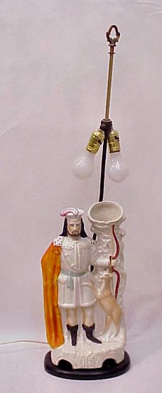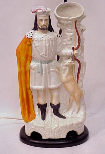 LARGE STAFFORDSHIRE FIGURE: Archer huntsman with deer. Plain back. Mounted as a lamp. 17 1/2''h, 36'' overall.