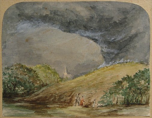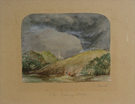 LINNELL, John, ? (British, 1792-1882): ''Skiddaw, from near Clifton, Cumberland 1849'', W/C glued to cardboard backing, 4 1/4'' x 5 1/2'', 7 1/2'' x 8 3/4'' with cardboard, pencil marked on cardboard ''The Rising Storm'', J Linnell in pencil lower right corner. Came with an early label with catalog information, title & artist.