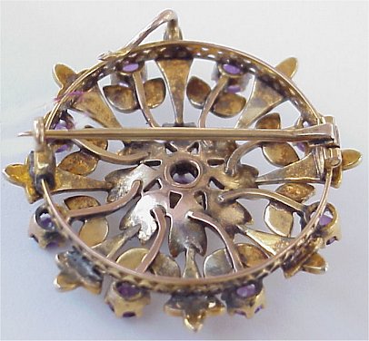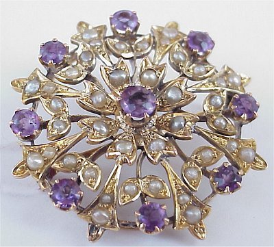 VICTORIAN AMETHYST SEED PEARL BROOCH: Hand made creation with a filigree gallery, assayed at least 18k, set with multitudes of tiny natural seed pearls and nine round cut amethyst approx. 2 ctw. Pin and loop for pendant, approx. 1 1/4''dia., 7.5 grams.