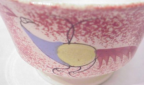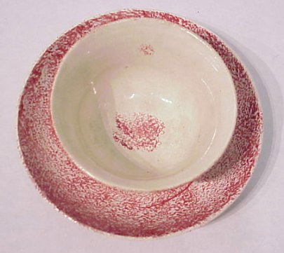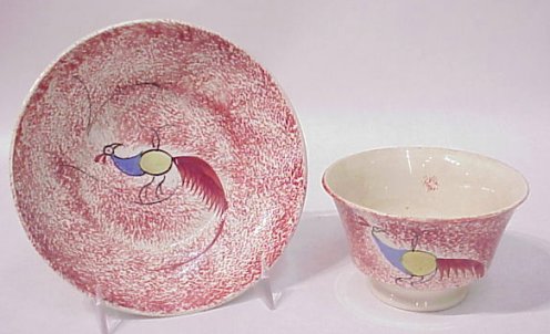 19TH C SPATTERWARE HANDLELESS PEAFOWL CUP AND SAUCER: Hand painted blue, light yellow and red peafowl on red. No chips or cracks. Interior of cup has slight discoloration under glaze.