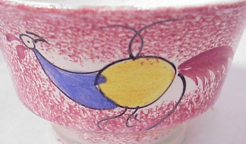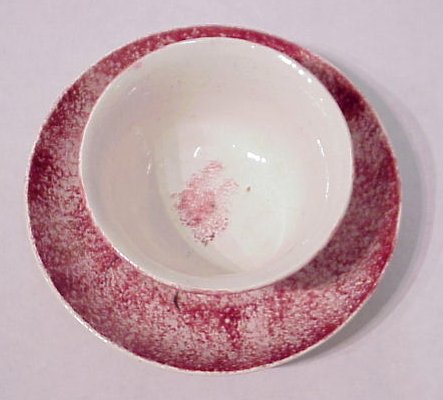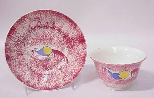 19TH C SPATTERWARE HANDLELESS CUP AND SAUCER: Hand painted Peafowl on red, impressed crown mark on underside of saucer. No chips or cracks.