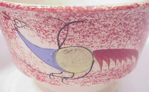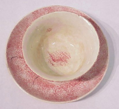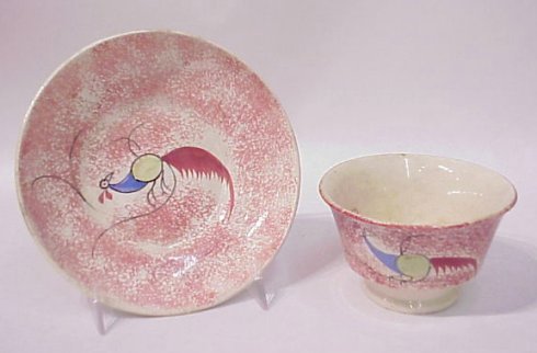 19TH C SPATTERWARE HANDLELESS CUP AND SAUCER: Hand painted blue, light green, and red peafowl on red. No chips or cracks, cup has discoloration under the glaze.