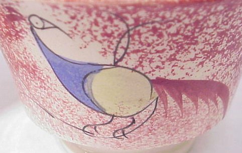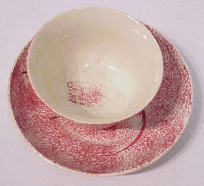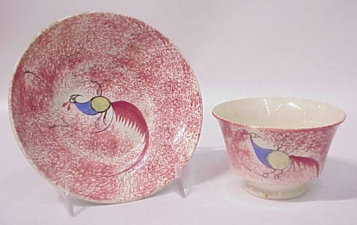 19TH C SPATTERWARE HANDLELESS CUP AND SAUCER: Hand painted blue, light green, and red peafowl on red. No chips or cracks, cup has discoloration under the glaze.