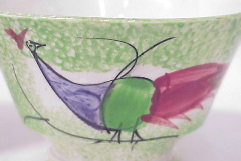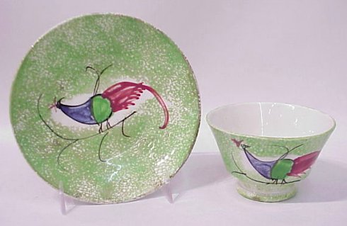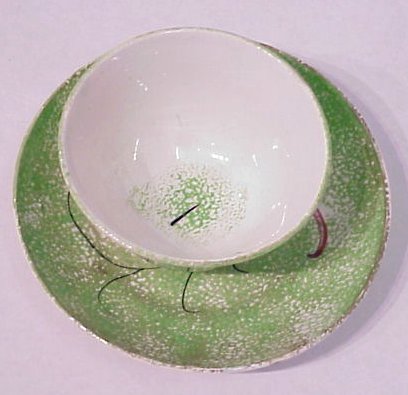 19th C SPATTERWARE PEAFOWL HANDLELESS CUP AND SAUCER: Green with hand painted peafowl in blue, green, and red. No chips or cracks.
