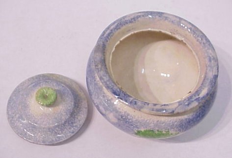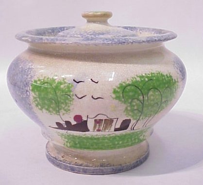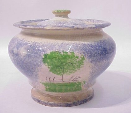 19TH C SPATTERWARE SUGAR BOWL: Blue with double sided decor, brown fort and green trees on front, back has a single tree. Cover has a green finial. Crazed glaze, minor chips to interior rim under cover. 4''h. No exterior chips or cracks.