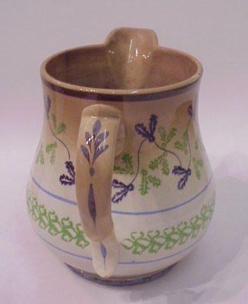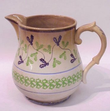 SPATTERWARE PITCHER: Stick spatter design of vines above a geometrical frieze. Heavy crazing and discoloration. 7 1/4''h.