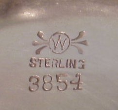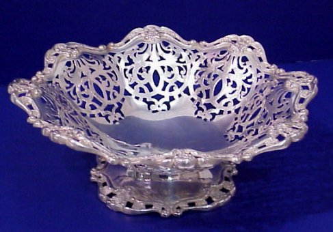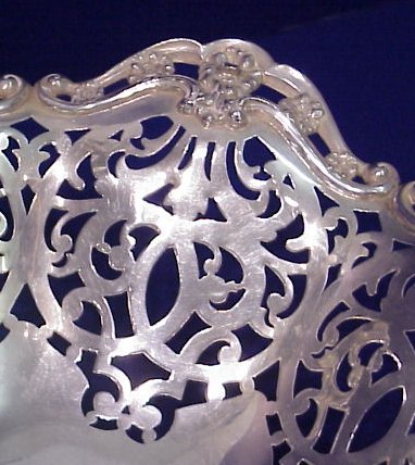 FRANK M. WHITING STERLING CENTER BOWL: Impressive bowl with pierced, scalloped, and repousse work. Pedestal base mirrors the scalloped design of the border. Hallmarked with the Frank Whiting emblem, 3854, A. Newsalt. 11 1/2'' dia. 4''h, approx. 16 oz.