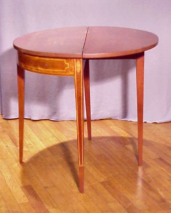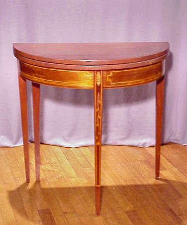 HEPPLEWHITE STYLE CHERRY DEMI TABLE: Half table with swing leg and hinged flip top opens to 31'' dia. With top folded down table is 15 1/2'' deep, 29 1/2''h. String inlay with floral inlay to the center leg.