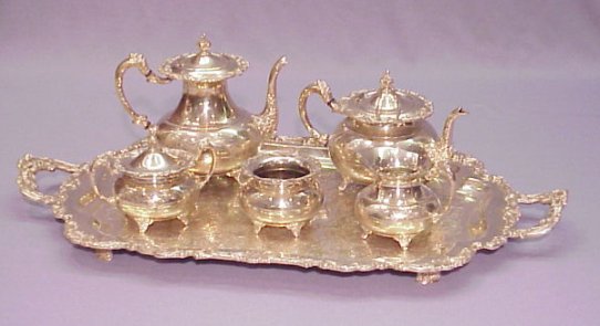 ''ASCOT'' COMMUNITY SILVER PLATE TEA SERVICE: Large 30'' handle tray, coffee pot, teapot, cream pitcher, sugar, and waste jar. Ascot is a Sheffield design reproduced by Community.