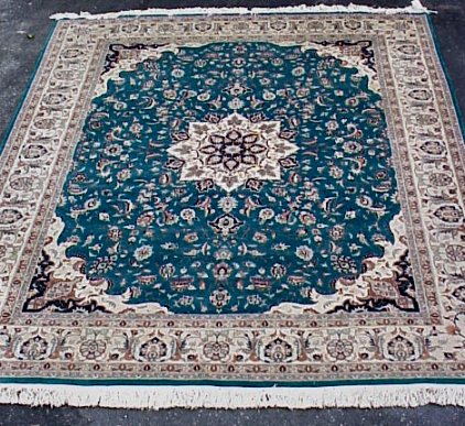 HAND WOVEN PAKISTAN CARPET: Approx. 8'2'' x 10'5''. Dark green ground. Very tightly woven. Retail price tag at $10,000.