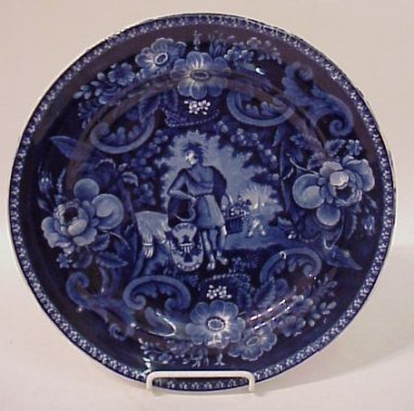 CLEWS HISTORICAL STAFFORDSHIRE BLUE PLATE ''PEACE and PLENTY'': Circa 1815-1834 by James and Ralph Clews. Dark blue, 10 1/8'' dia. Impressed Clews mark.