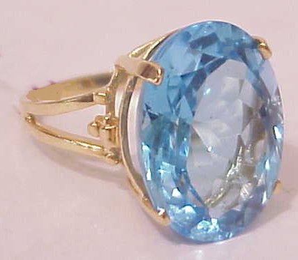LADY'S BLUE TOPAZ RING: Large oval brilliant cut blue topaz, approx. 20mm x 15mm, set in galleried mount of 14k yellow gold, size 8.