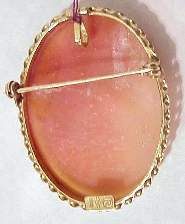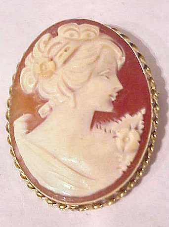 LOVELY SOFT SHELL CAMEO: Profile of delicate flower bedecked maiden, framed in 14k yellow gold with twisted edging, marked R in circle, 585 and makers mark, pin and swivel pendant, 1 1/2'' x 1 1/8'', 6grams.