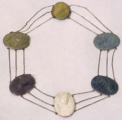6 LAVA CAMEO NECKLACE: Each in a different shade featuring a different Grecian figure, each approx. 1 1/2'' x 1 1/8'', framed in metal at one time probably gold plated, connected on each side by triple chains, pressure clasp, approx. 16''l., please note loose chip to back of green, most cameos glued back into frames.