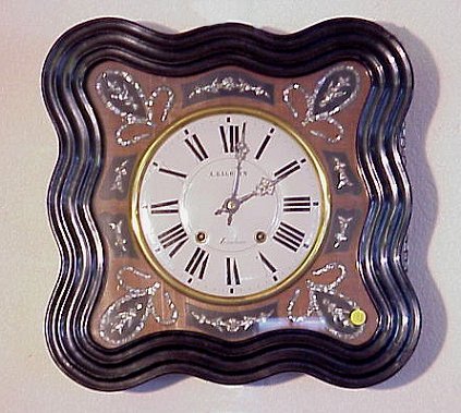 FRENCH REPEATER CLOCK IN PICTURE FRAME STYLE MOTHER OF PEARL INLAID CASE: Double strike hour strikes at the hour and 2 minutes later, strikes once at half hour. Enamel dial marked A. Balorin Louchens. Roman numerals. With key and pendulum. 18 1/2'' x 18 1/2''.