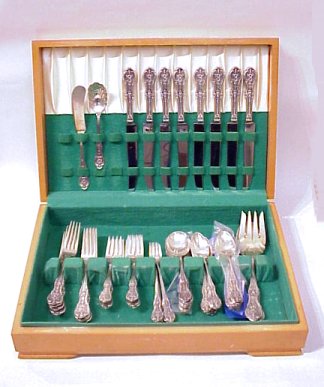 INTERNATIONAL STERLING SERVICE IN THE ''SPRINGTIME'' PATTERN: 60 piece service for 8 to include 8 dinner knives (8 1/2''), 8 dinner forks, (7 3/4''), 8 salad forks, 8 cocktail forks, 16 teaspoons, 8 round soup spoons, large meat fork, serving spoon, flat handle master butter, and the sugar shell. No monogram.