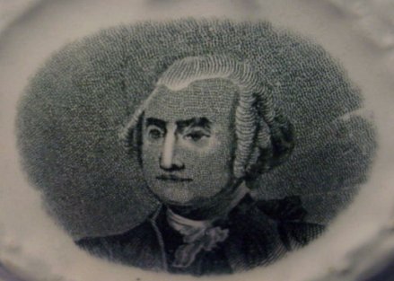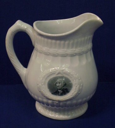 HISTORICAL STAFFORDSHIRE ELSMORE & FORSTER EARTHENWARE JUG: Dated 1867. Showing two black transfer images of George Washington in embossed wreath. 7 1/2''h. No chips or cracks. Raised mark of Elsmore & Forster, Tunstall, and the registry mark.