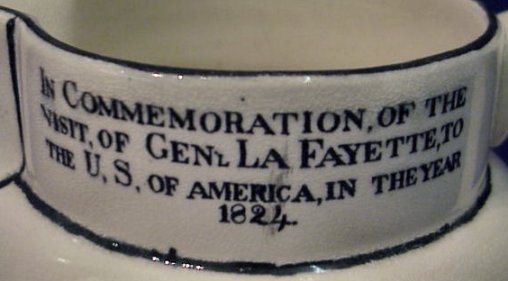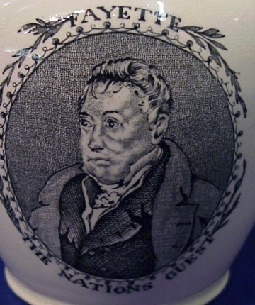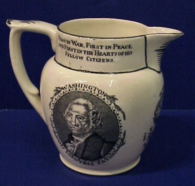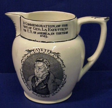 LIVERPOOL EARTHENWARE HISTORICAL TRANSFER DECORATED JUG: 5''h. Black transfer design ''Washington His Country's Father'' on one side, ''Fayette The Nations Guest'' on the other. Commemorating the visit of General Lafayette to the U.S. in 1824. ''Republicans Are Not Always Ungrateful'' printed above the maker's mark of Ric'd Hall & Son. No chips or cracks.