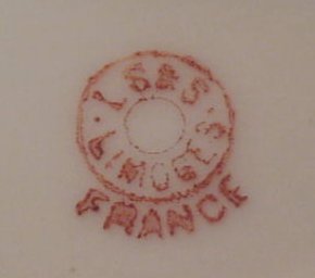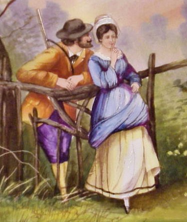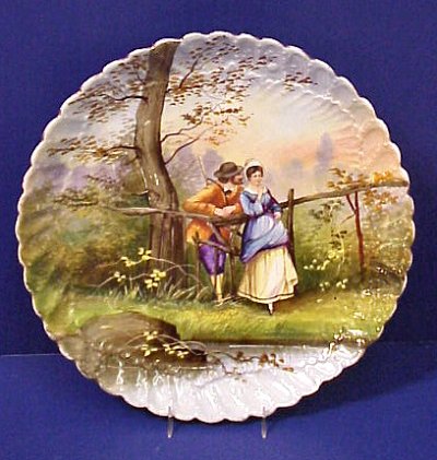 FRENCH LIMOGES HAND PAINTED CHARGER: A quaint courting scene of French Provencal. Scalloped rim, 13 1/4'' dia. Red mark over glaze for LS & L Limoges France. No chips or cracks.