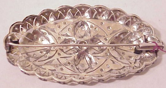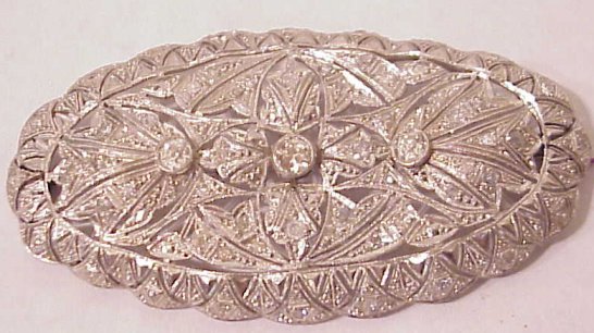 OVAL PLATINUM FILIGREE DIAMOND BROOCH: Oval floral filigree pin of platinum set with diamonds, 2 1/2'' x 1 1/4'', three bezel set diamonds across center, approx. 15 to 20pts each, small diamonds and platinum bead work scattered throughout, approx. 19grams.