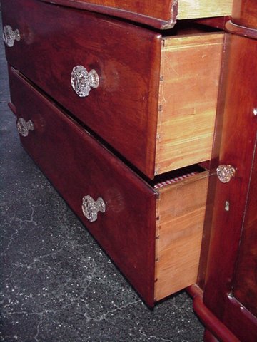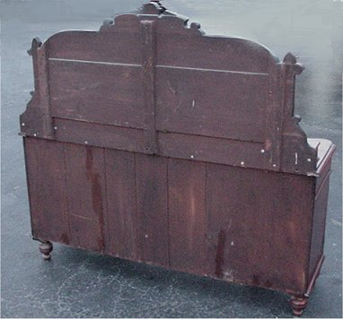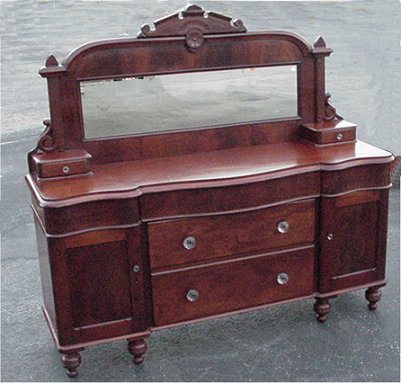CHERRY VICTORIAN SIDEBOARD WITH MIRROR BACKBOARD: Carved crest over the mirror. Top 3 drawers follow the lines of the serpentine top. Lower two drawers are flanked by cabinet doors, all with hefty glass knobs. Exceptional quality. Approx. 64''h, overall, 69''w, x 22''deep.