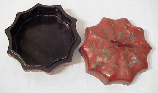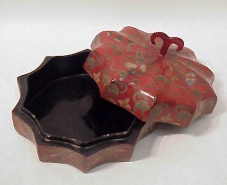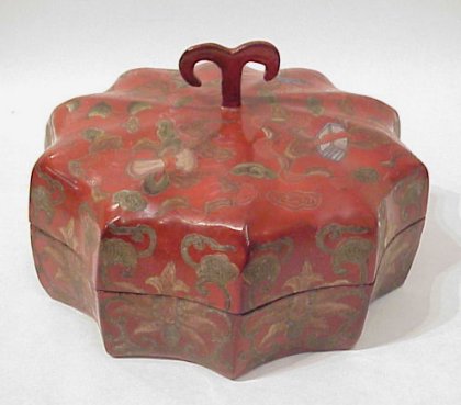 CHINESE RED LACQUER BOX: Fluted, round shaped covered box. 9'' dia., 3 1/2''h.