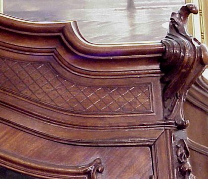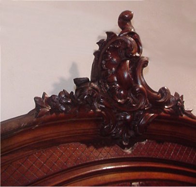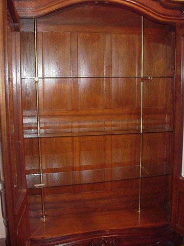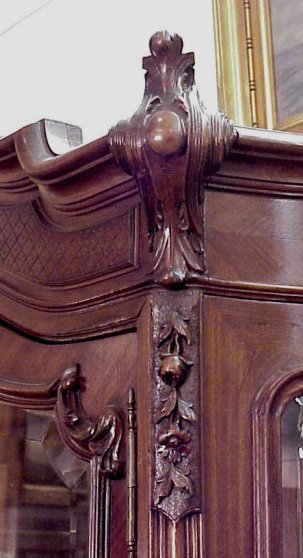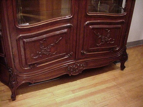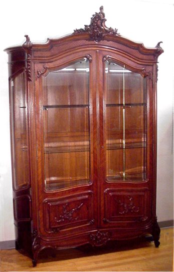 ELEGANT FRENCH DOUBLE DOOR CURIO: Double shaped beveled glass doors and curved shaped beveled glass sides, carved wood to bottom of doors creating hidden space, glass shelves with supports, lavishly carved crest, 101 1/2''h. x 70''.