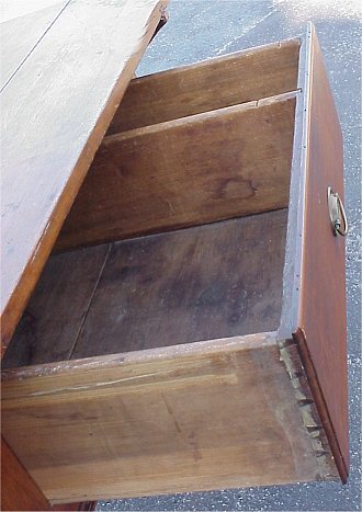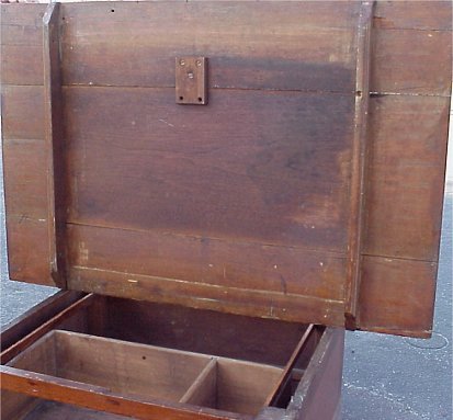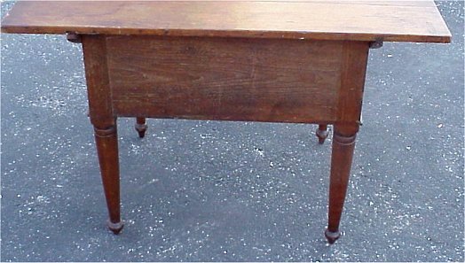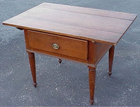 MID 19TH C. WALNUT WORK TABLE: Ample surface space over one divided drawer, top lifts off. Mid-Atlantic or southern origin. Work surface is 29'' x 43 1/2'', 29''h.