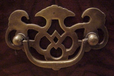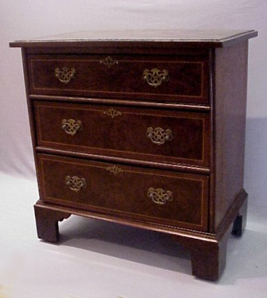 ENGLISH GEORGIAN STYLE THREE DRAWER CHEST: Banded top and drawer fronts with sting inlay. Exotic Tamo wood panels, pierced bat wings pulls and 20th Century construction. 31''h x 30''w x 16''d.16''d.