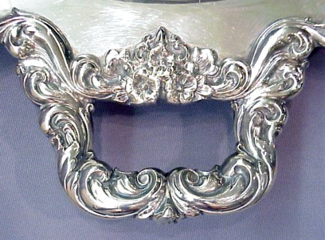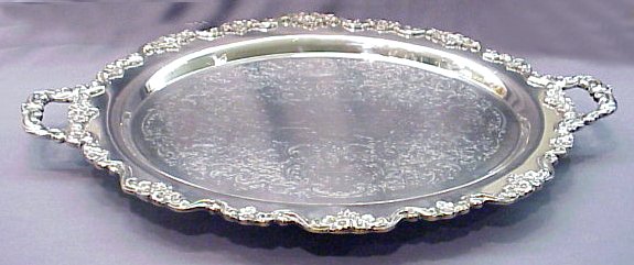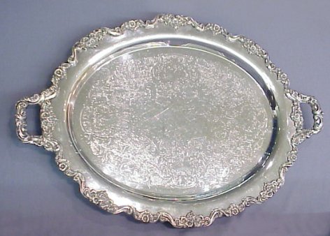 POOLE SILVER CO. ''LANCASTER ROSE'' FOOTED TRAY: A very substantial silverplated tray, 30''l, 20 1/4'' wide. Surface has minor scratches.