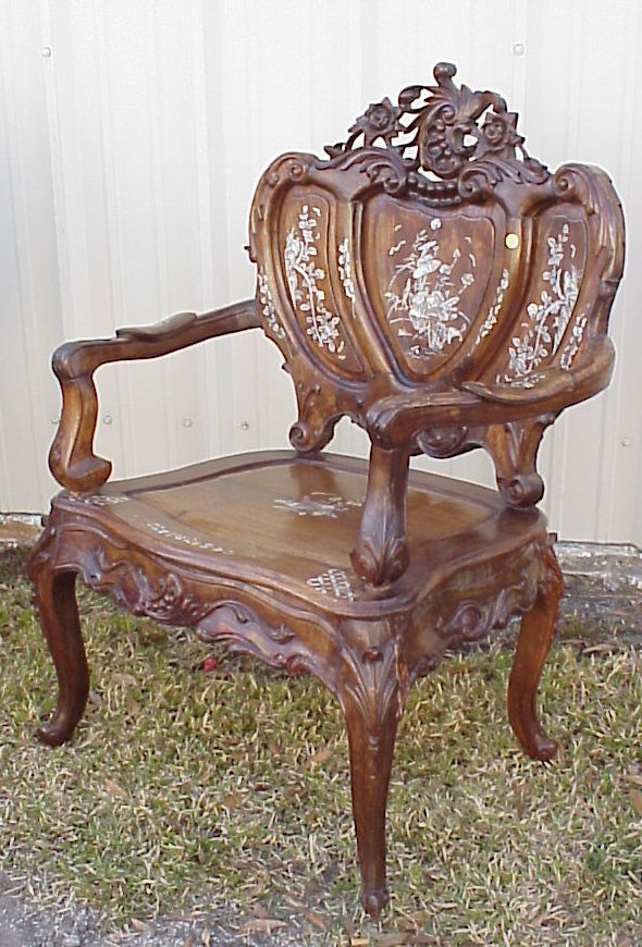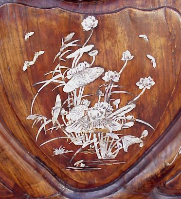 3 PC INLAID ORIENTAL ROSEWOOD PARLOR SUITE: Comprising, open arm settee with two matching open arm side chairs. All inlaid with delicately detailed floral motif with birds in flight, butterflies and flowers. Shield shaped back splats crested with full bodied rose carving and leaf motifs. Settee 48''h. x 52''w.