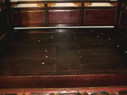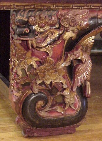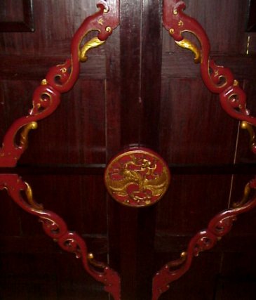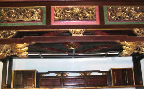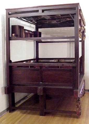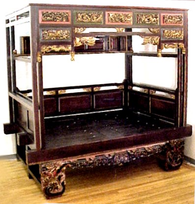 LATE 18th C CENTURY CARVED CHINESE WEDDING BED: Platform encased in an ornately carved, gold leaf and red enhanced surround. Winged Dragon motif carvings. Piece assembly. 97''h x 103''l x 67''w