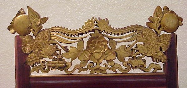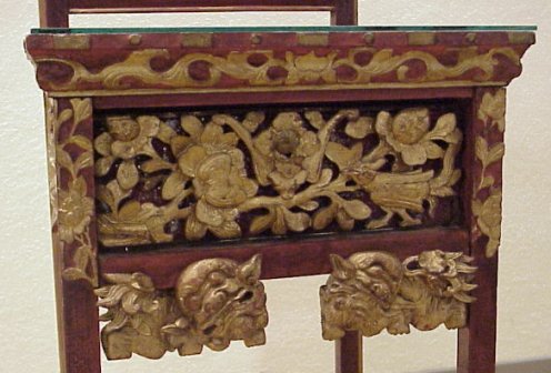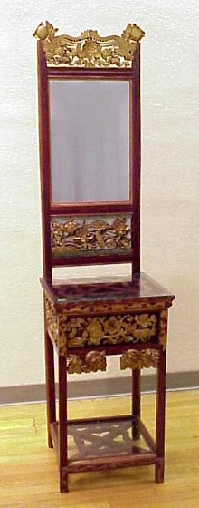 CHINESE CARVED, GILT WOOD WASH STAND: Gilt and carved wood. Mirror over one drawer. 2 pierce carved tiers fitted with glass. Approx. 71''h, 17 3/4''w x 17 1/2'' deep. Hails from the same estate as the Wedding Bed.