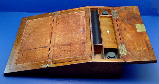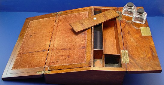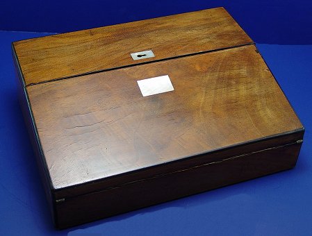 19TH C WALNUT LAP DESK: Slant front writing box with interior fitted with ink bottles, pen tray, and covered storage. Velvet covered writing surface. Mother of pearl escutcheon. 3 3/4''h. x 12'' x 9''.
