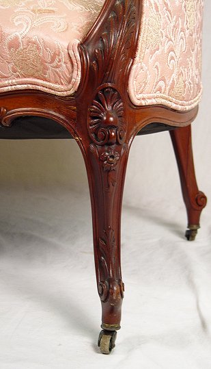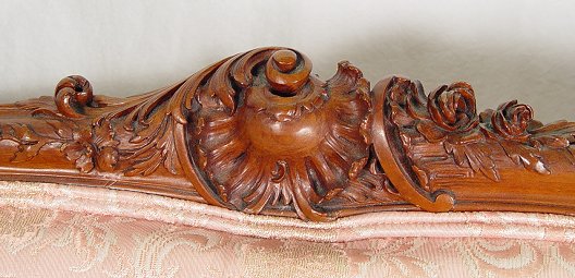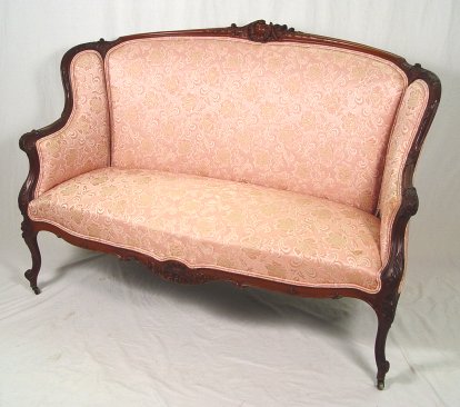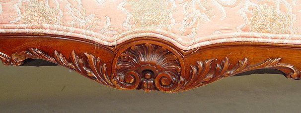 19TH CARVED SETTEE: High back settee with elegantly carved mahogany frame. Cabriole legs, shaped skirt, 41''h, 58''l, 30'' deep.