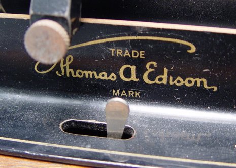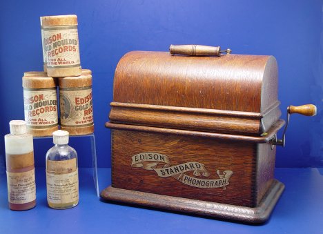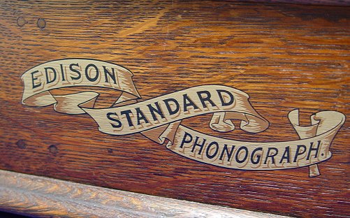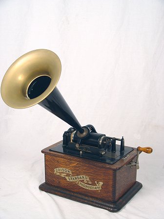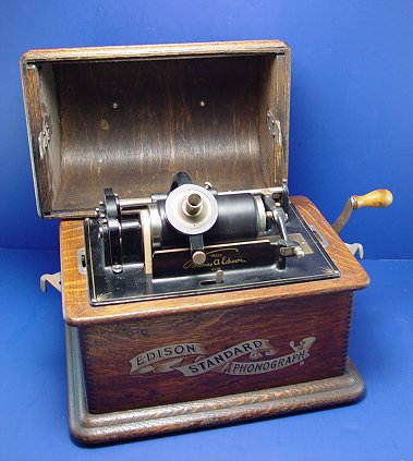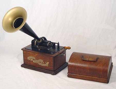 EDISON STANDARD WIND UP VICTROLA: Golden oak hump back carry case. #SS802270. Sold with two cylinders. 11 1/2''h. x 13''.