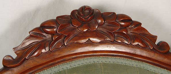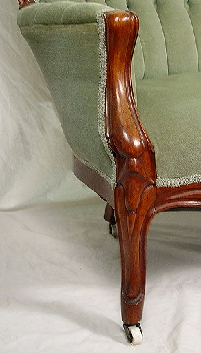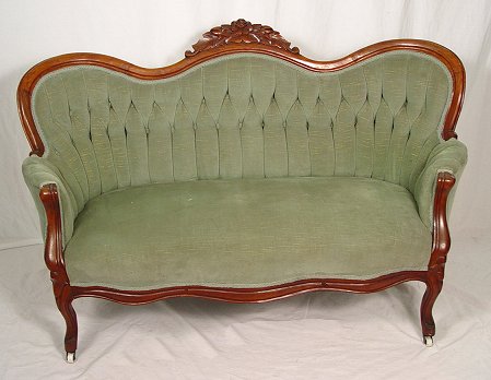ROCOCO REVIVAL WALNUT VICTORIAN SOFA: Molded serpentine crest rail centering floral carving, serpentine seat rail, green velvet upholstery button and tufted across the back. 35 1/2''h. x 55''l