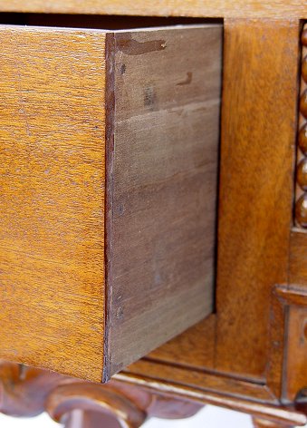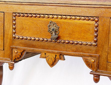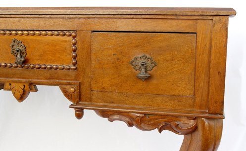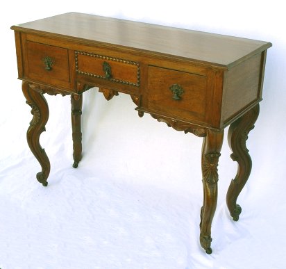 VICTORIAN WALNUT HALL TABLE: Three drawer hall table with scrolling floral carved legs, bead trim to center drawer, intricate bell pulls, carved apron, note cracking to top. 43''w. x 16 3/4''d. x 33 3/4''h.