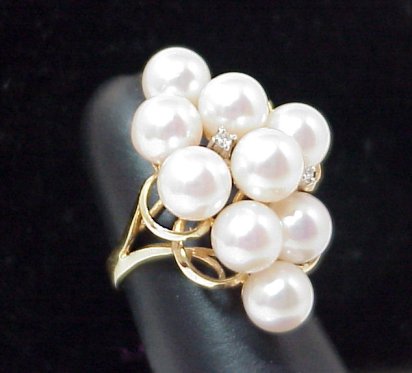 LADY'S 14K PEARL DINNER RING: Nine 7mm pearls with a soft pink glow set in 14k yellow gold with two little diamond accents, size 6, 9 grams, marked 585 14k and flower.