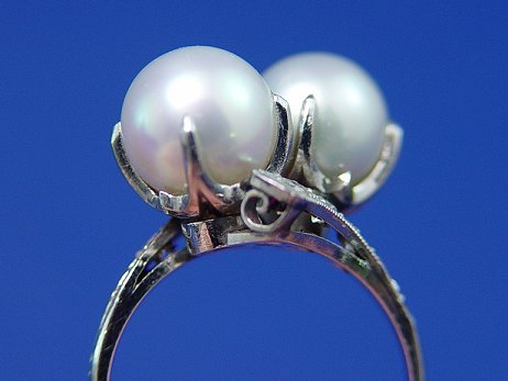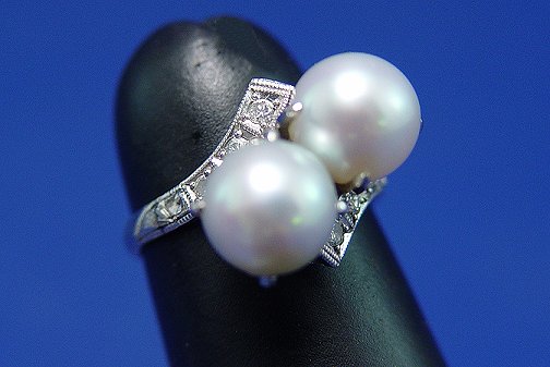 PLATINUM PEARL BYPASS RING: Two 8mm silver white pearls prong set on platinum bypass mount with three small diamonds to each etched arm, illegible makers mark DM?, size 4.75, 5.4grams. Est. $300/500**