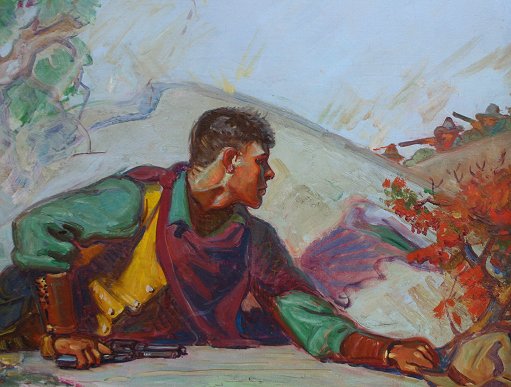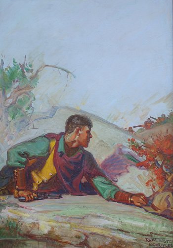 SCHUYLER, Remington, (American, 1884-1955): ''Shootout'', O/C/B, 31 1/4'' x 22 1/2'', SLR. Condition - Mounted on acid-free, inpaint visible by black light in the sky mostly, and sporadic, very minor paint flecks. Est. $2000/4000**