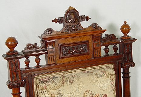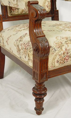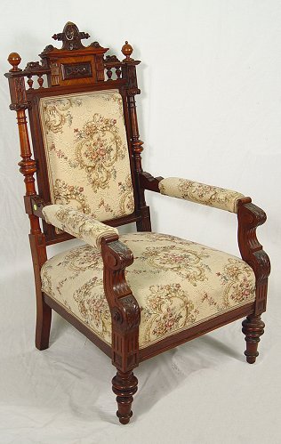 FINE VICTORIAN RENAISSANCE REVIVAL PARLOR CHAIR: Open arm chair with an ornate relief carved top rail and arm supports.