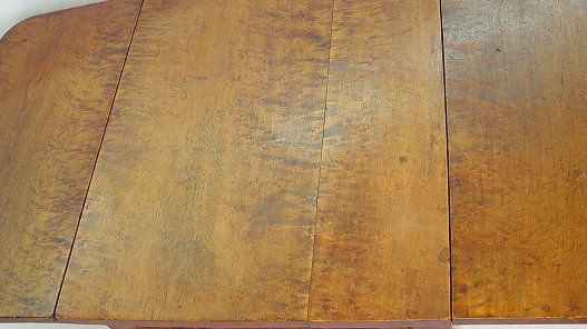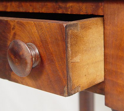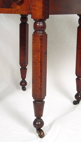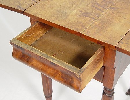 19th C TWO DRAWER DROP-LEAF WORK STAND: Flame grained mahogany ogee top drawer. Burled top surface with drop leaves opens to 37 1/2''w. 30''h.