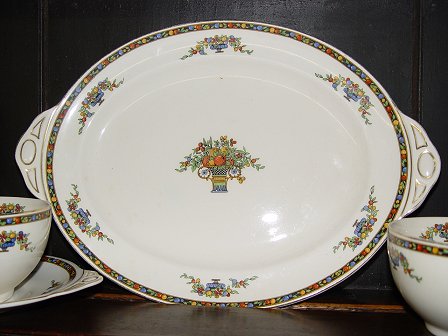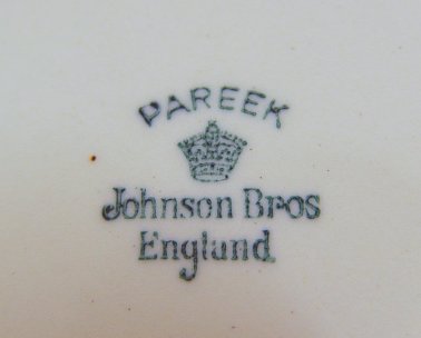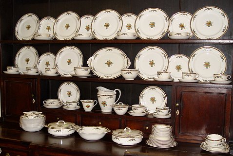 SET OF JOHNSON BROTHERS ENGLISH CHINA FOR 9: Lovely fruit basket motif in the ''Marjorie'' pattern, gilt accents on handles and edges in good condition. This is a large set of eighty-two pieces, full service for nine with extras, to include: Platter (13 3/4'' at the handles), open vegetable, two covered vegetables, pitcher (7'' h), creamer, covered sugar, gravy bowl with underplate, 9 Dinner plates (10''), 9 Lunch plates, 10 Bread plates, 12 Berry bowls, 9 cups, 11 saucers, 5 cream soups with 6 underplates, 12 low soup bowls, and 2 bowls (5''). There are no chips or cracks in the pieces stated, crazing on a few pieces. The mark states ''Pareek, Johnson Bros., England, Marjorie''.