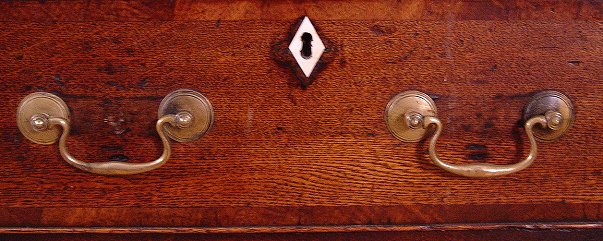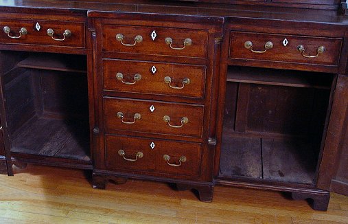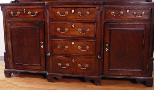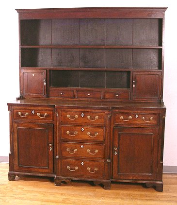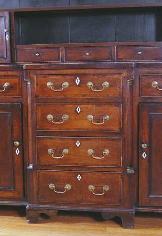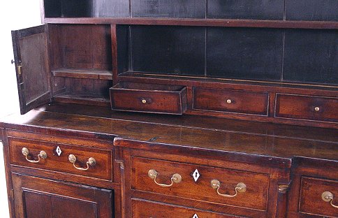 ENGLISH DRESSER WITH SPICE DRAWERS: Ca. 1780. Two part cupboard with upper section being open shelving and spice drawers. Ivory escutcheons, banded drawers, lower section with cabinet doors. 83''h, 72 1/'' x 21 3/4''. Est. $6000/8000**