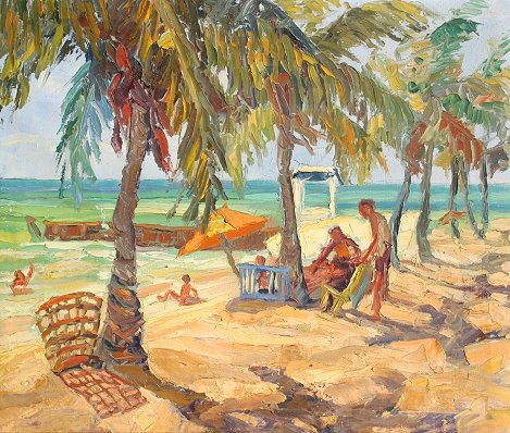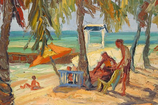 HIGH QUALITY AMERICAN IMPRESSIONIST BEACH SCENE WITH FIGURES: O/C, 21'' x 25'', unframed, very thick impasto, no visible signature. Condition - Some abrasions with minor paint loss; overall good condition.