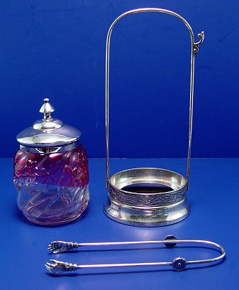NORTHWOOD GLASS ''ROYAL IVY'' RUBINA PICKLE CASTER: Cranberry glass shaded down to faint pink, embossed ivy leaves. In a Rogers Smith & Co. silverplated frame and hand shaped tongs.