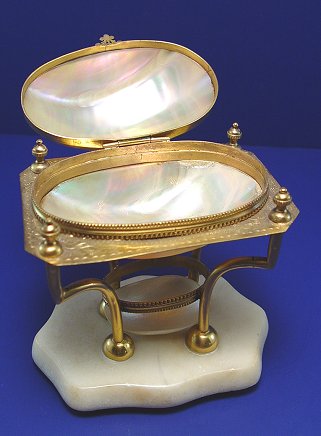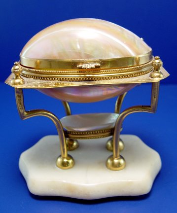 VICTORIAN MOTHER OF PEARL JEWEL CASKET: Gilt mounted, on a marble base. Hinged top on upper shell, lower shell is open. 6''h. x 5''w.