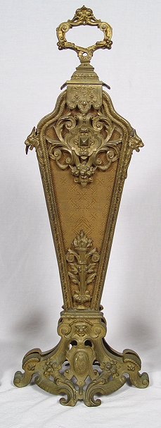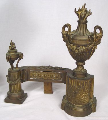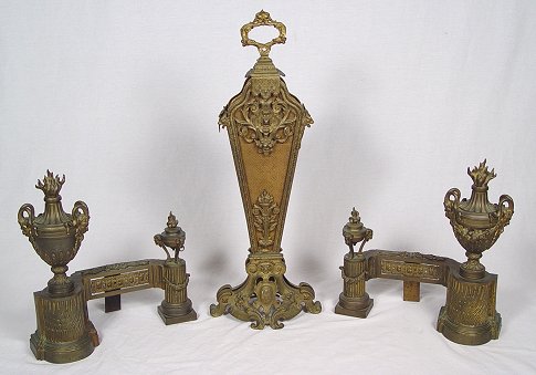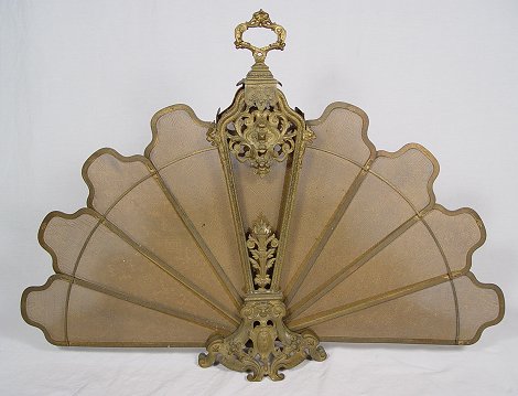 VINTAGE CHENETS AND PEACOCK FAN FIRE SCREEN: Brass chenets featuring fire filled urns decorated with floral swags and rams head masquerons, approx. 15'' x 16 1/2''h. x 7''d. each, inner ends with hook for missing center bar. Peacock fan screen with decorative metal mesh in each shell, overall 40''w. open and 8''w. closed, 29''h.