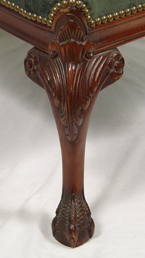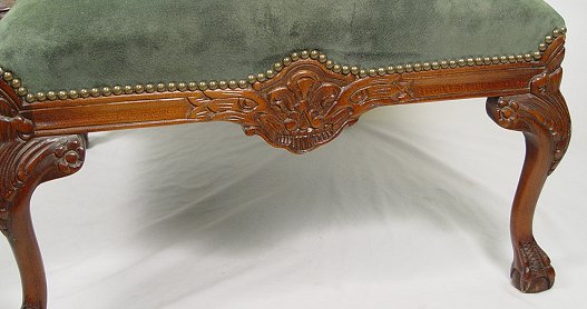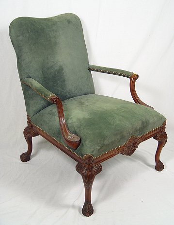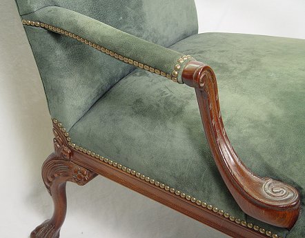 CHIPPENDALE STYLE MAHOGANY FRAMED OPEN ARM CHAIR: Carved mahogany framed chair recently upholstered in green suede(?). Finely carved details to the seat rail and legs. 37''h, x 30'' x 26''.